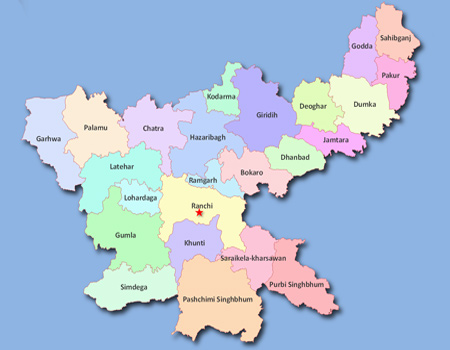 Jharkhand is bounded by West Bengal in the east, Uttar Pradesh and Chhattisgarh in the west, Bihar in the north and Orissa in the south.